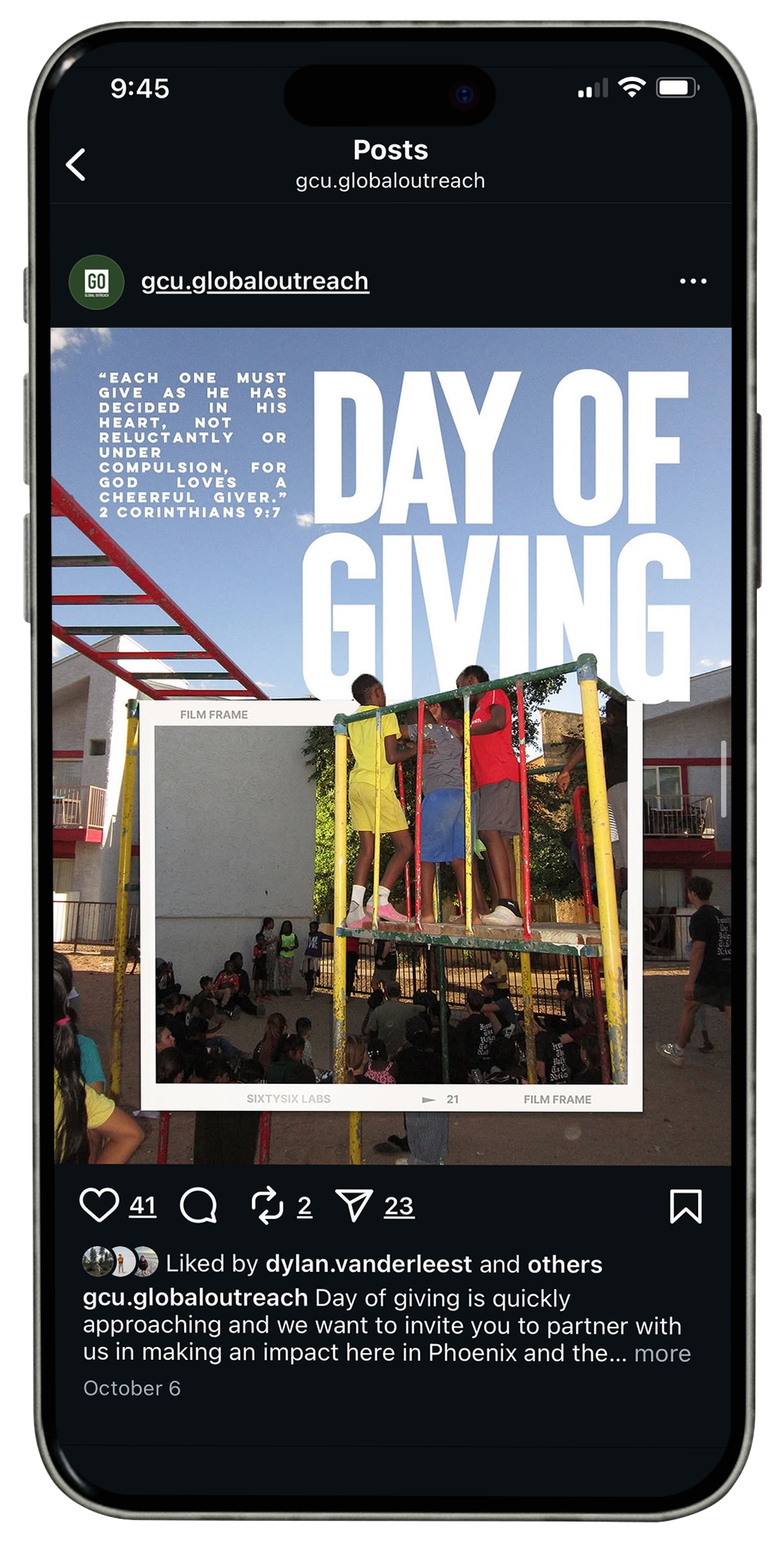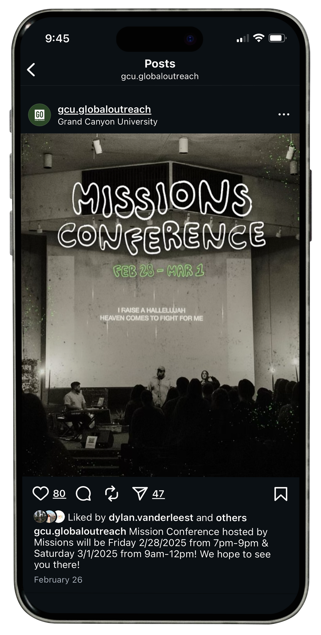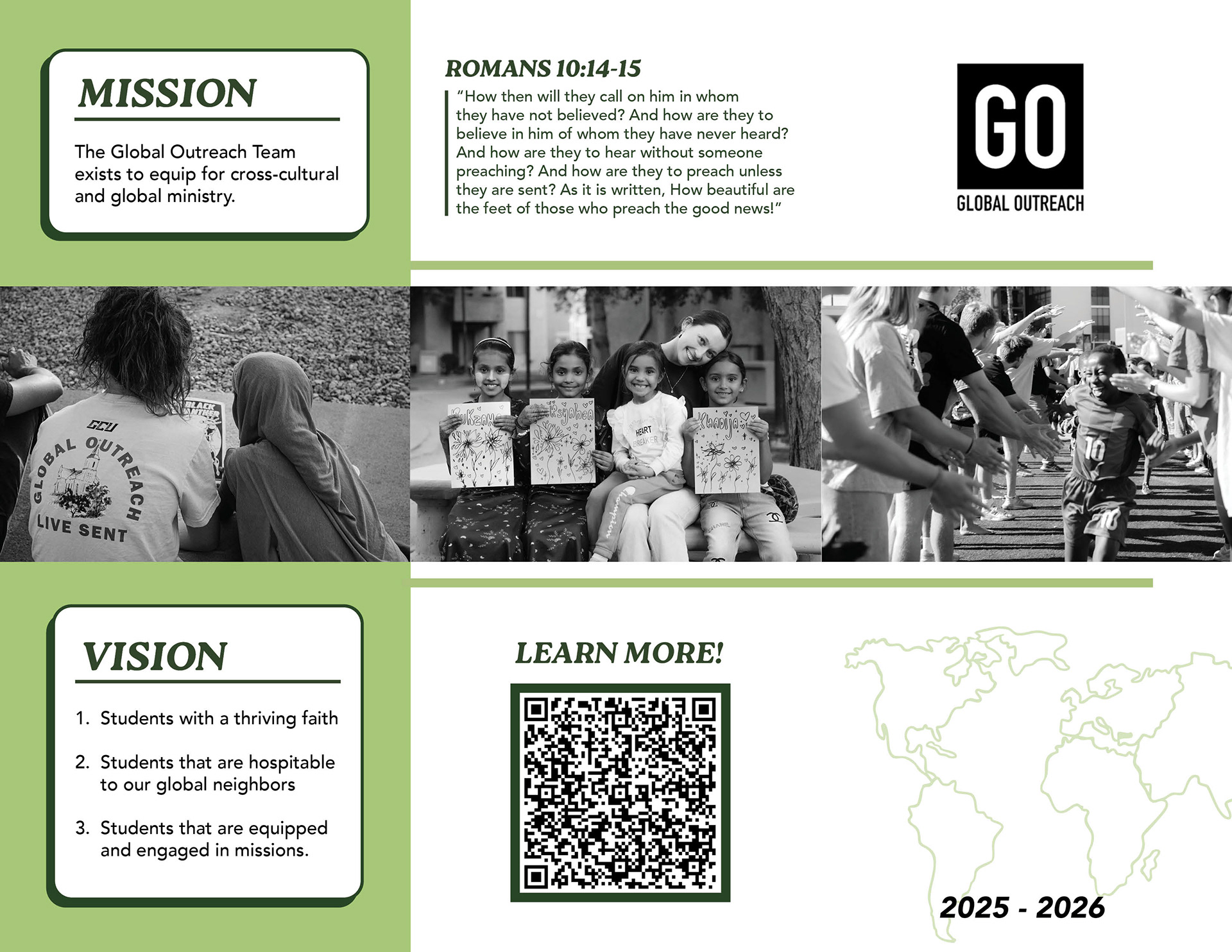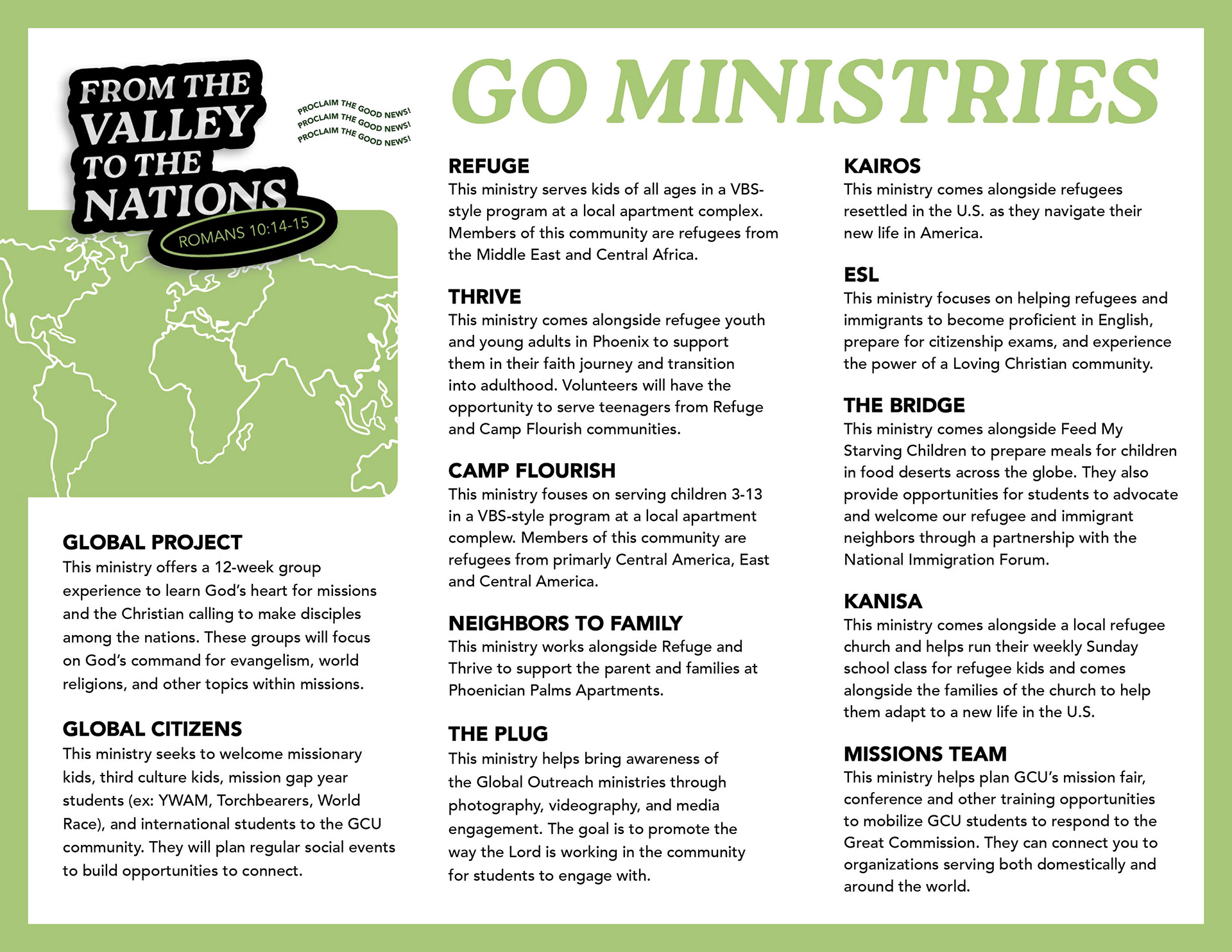 Global Outreach is an organization on Grand Canyon University’s campus made up of 14 different ministries that support and equip students for cross-cultural ministry. My responsibility as the graphic designer for Global Outreach was to develop consistent branding across different media types that reflect the heart behind Global’s mission. In my position, I developed graphics for social media, merchandise designs, and stationery handouts for tabling events.